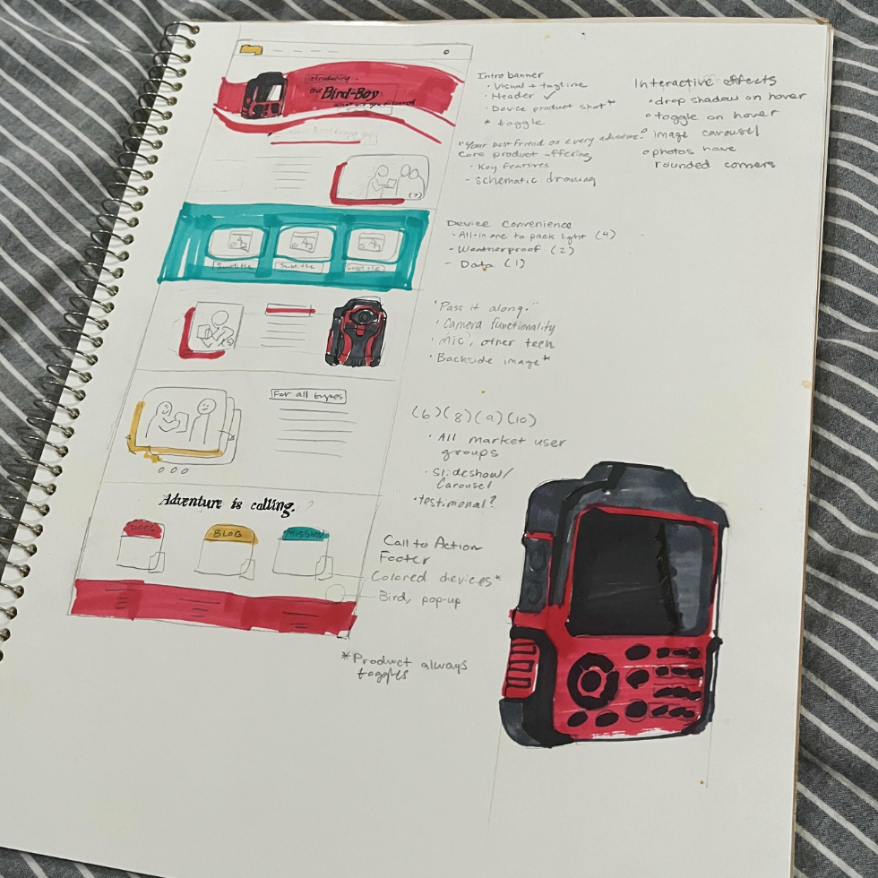 The Bird-Boy is a conceptual handheld device for which I created an entire product website via Docusaurus. The project was meant to combine a multivaried skillset of marketing, branding, technical writing, and design into a cohesive product identity. You can check out the actual website here, which will include the following assets (all developed by me personally):